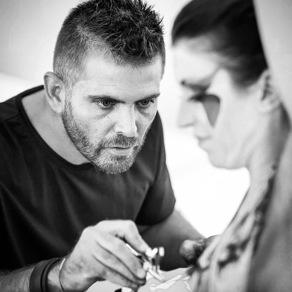 Nella parte frontale ho voluto omaggiare le origini dell’opera, italiane, e per questo la ho utilizzato i colori della nostra bandiera, dove Giuseppe VERDI con il rigoletto occupava la parte verde a sinistra, nel bianco le farfalle salgono sul viso orientale di una Madame Butterfly, opera di Puccini. A destra, nel Rosso, il compositore Rossini si rade la barba, ricordando l’opera Il Barbiere di Siviglia e Guglielmo Tell sulla spalla.